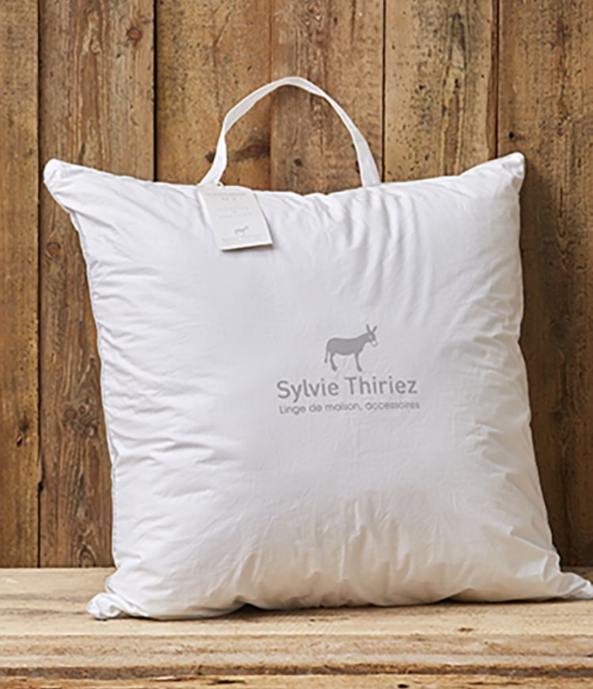This 100% polyester microfiber pillow is made in France. It has a 100% cotton percale cover.