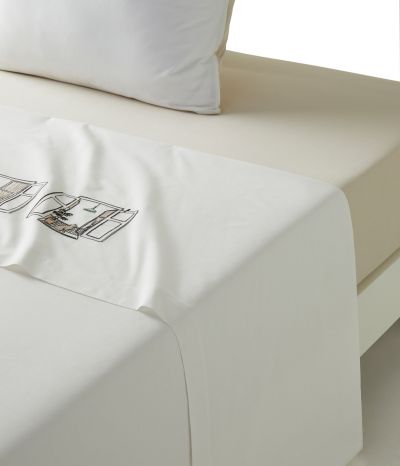 The sketch is embroidered on a percale of mascarpone cotton and small touches of colors are slipped in touches in the illustration. This case represents the joyful simplicity of everyday life, a piece of tapestry, children playing hide and seek, cats coming in and cats coming out.