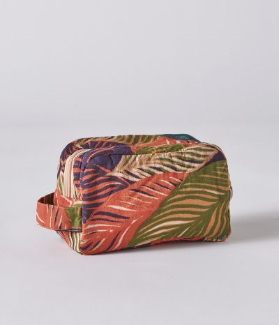 Plum, lichen green, coral pink and celadon blue created vibrant encounters with sandstone brushstrokes of this bold design. The wide leaves printed on a cotton percale plunge you into a shimmering cocoon.